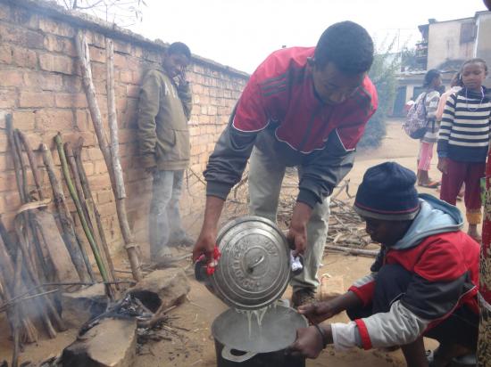 de la cuisson dans la cour de l'école jusqu'au service dans la salle de classe ,
